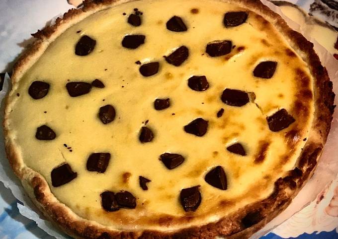 - Stendere la frolla, adagiarla in una tortiera da 20cm, bucherellare il fondo con una forchetta, versare la crema. Se volete potete aggiungere in superficie dei pezzettini di cioccolato fondente..